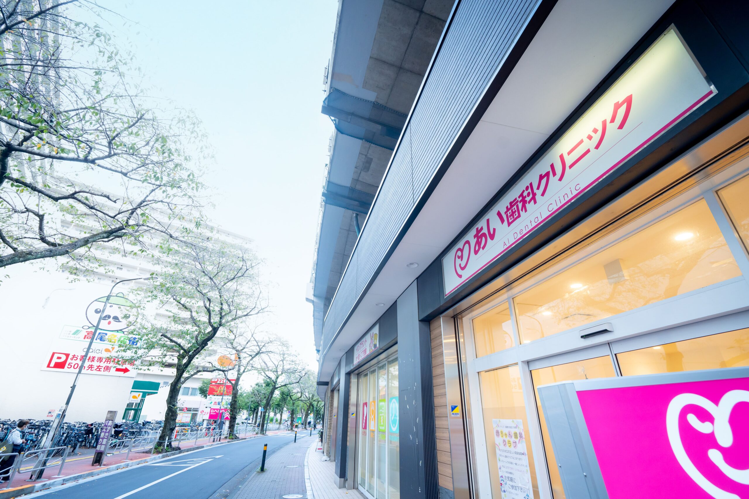 JR中央線、京王高尾線「高尾」駅・南口を出て階段を降り、直進します。横断歩道を渡ったら、クリーニング屋さんの隣にあい歯科クリニック高尾があります。