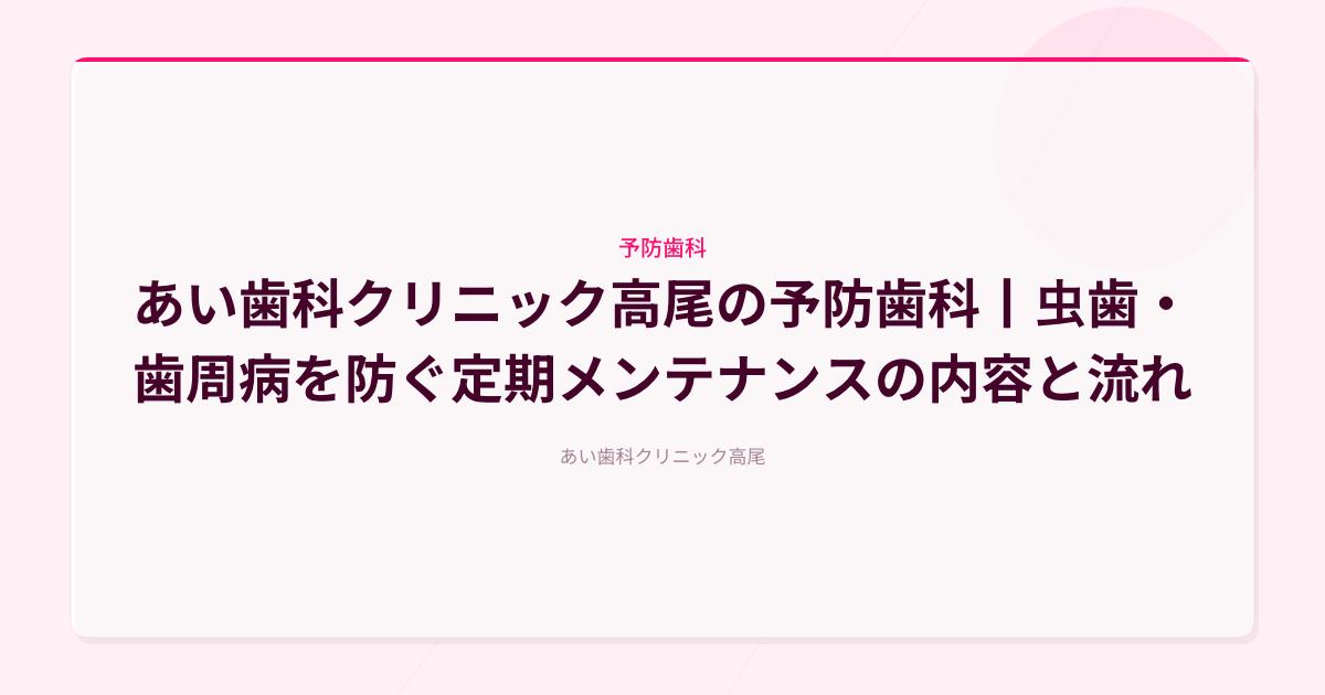 あい歯科クリニック高尾では、患者さま一人ひとりのお口の状態に合わせた予防プログラムをご提案しています。この記事では、当院の予防歯科で行う具体的な診療内容、定期メンテナンスの流れ、通院頻度や費用について、詳しくご説明します。