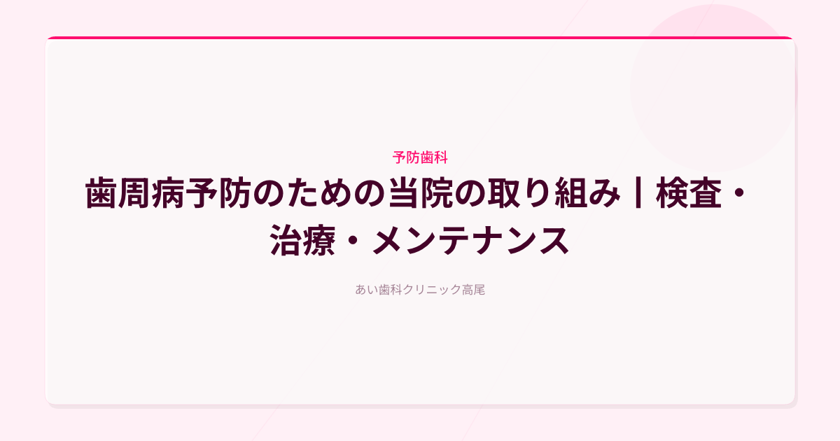 この記事では、あい歯科クリニック高尾で行っている歯周病予防の取り組みについて、詳しくご紹介します。当院では、精密な検査で現状を把握し、一人ひとりに合わせた予防プランをご提案しています。