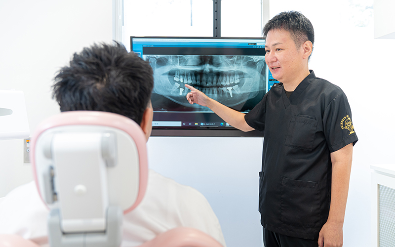 治療内容はわかりにくいものが多いですが、口の中を大きく拡大した画像をご覧いただき、できるだけわかりやすく説明させていただきます。お口のカルテをお渡しします。